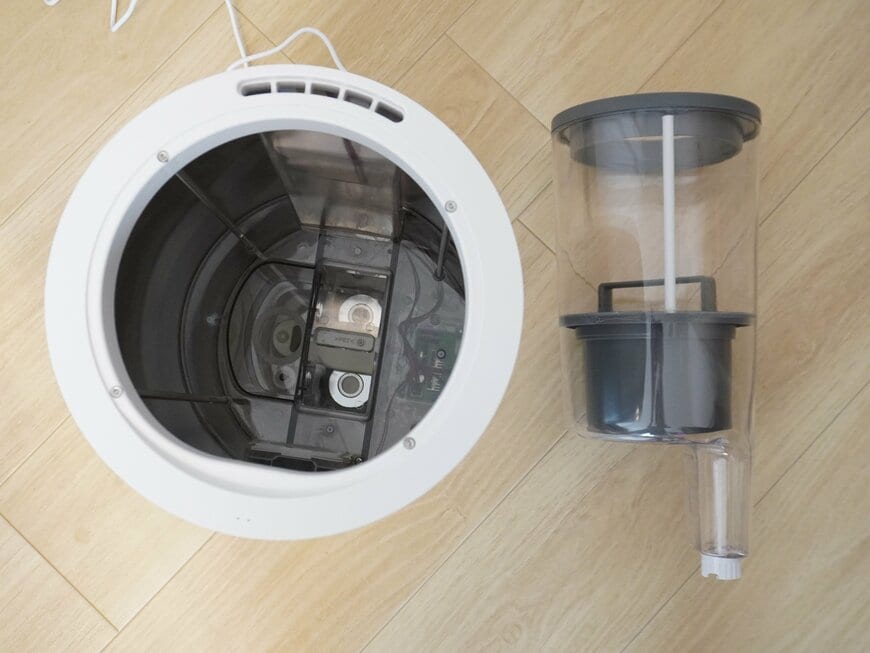 内部の水を抜きたいときは、底部に水抜き用の穴があるので、そこから排水します。内部のパーツはすべて取り出すことができ、スケルトンなので汚れの状態を確認しやすく、メンテナンスも楽でした。