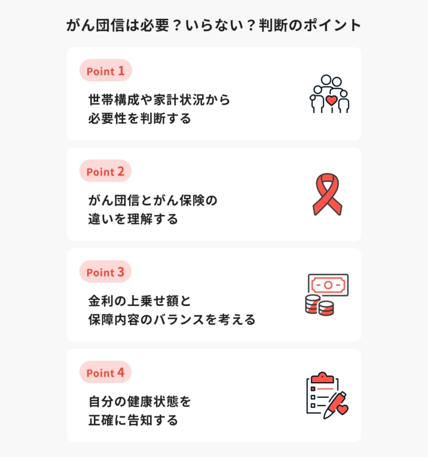 がん団信に加入しておくべきかどうかは、個人の状況により大きく変わります。以下の4つのポイントから総合的に判断しましょう。