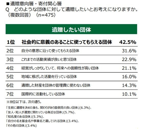 日本財団が2023年に発表した「遺言・遺贈に関する意識・実態把握調査」では、遺贈したい団体は「社会的に意義のあることに使ってもらえる団体」(42.5%)がトップとなっており、次いで「自分の意思に沿って使ってもらえる団体」(31.6%)という結果が出ています。