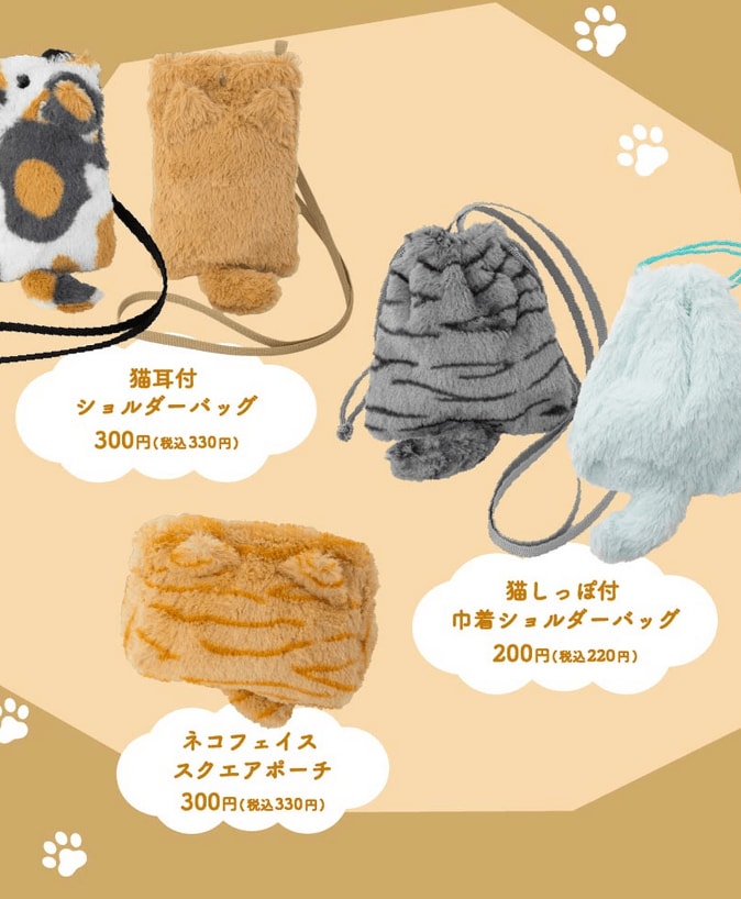 ふわふわ素材を使用したやさしい触り心地は、まるでお気に入りの猫をなでているよう。ラインナップは「猫しっぽ付巾着ショルダーバッグ」(200円・税込220円)、「猫耳付ショルダーバッグ」(300円・税込330円)、「ネコフェイススクエアポーチ」(300円・税込330円)の3種類。どれも小物やスマホを入れるのにちょうど良いサイズで、近所へのお出かけや旅行時のサブバッグにもぴったりです。