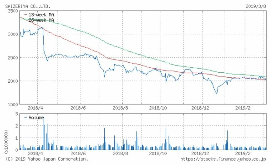 同社株価は2018年1月の3,800円台から下落を開始。12月25日に1,696円の安値を更新するも、1月に2,000円台を回復しました。2月はほぼ2,000円前後の取引で終始し3月に入りました。