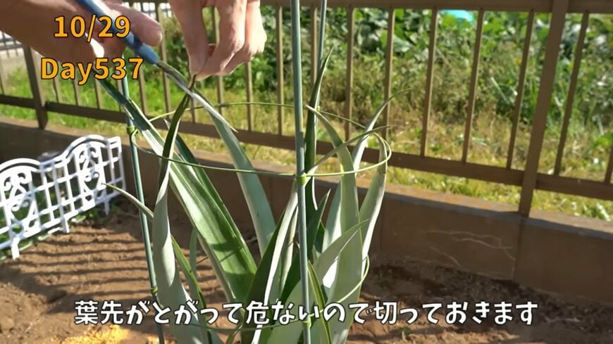 これから翌春までは室内での管理になるため、伸びた葉が場所を取らないようリング支柱を設置してひとまとめに。葉の先端のとがっている部分は、危ないのでカットしたそうです。