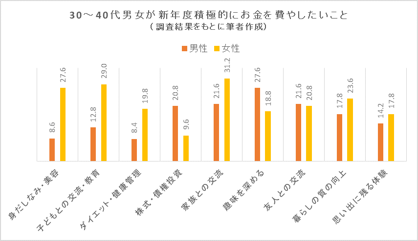 【新年度に積極的にお金を費やしたいこと(男女の差が大きい順)】