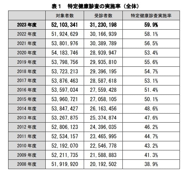 40〜74歳を対象にした特定健康診査の実施率は2023年度は59.9%にのぼり、半数以上の人が検査を受けているという状況です。