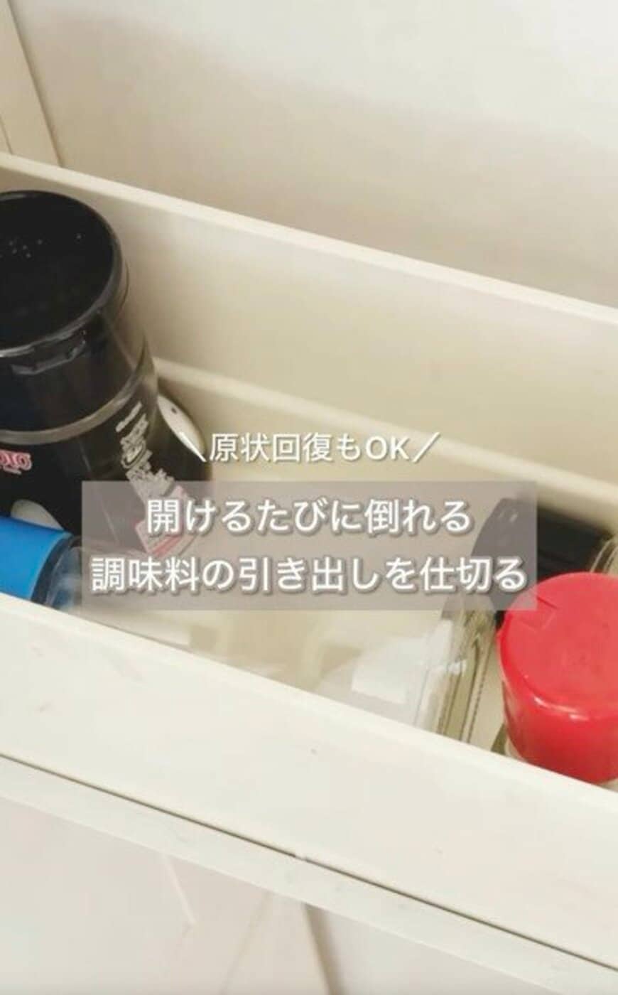 1. 【引き出し仕切りDIY】開けるたびに調味料が倒れるストレスをスッキリ解消!