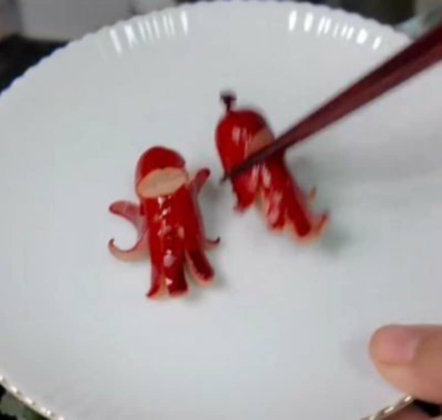 赤ウィンナーはたこになるよう足と顔を作り、フライパンの空いたスペースで焼いていきます。