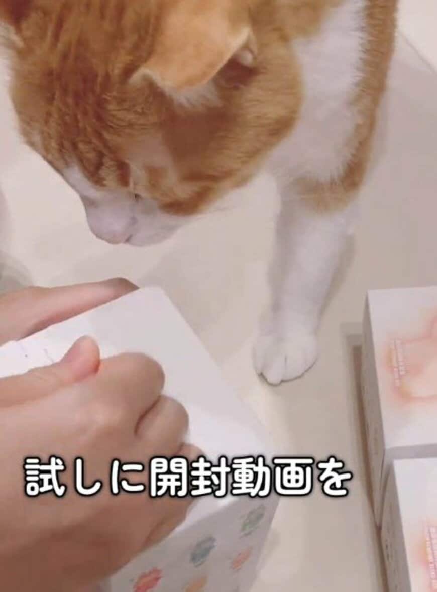 1. 箱の開封シーンに興味深々の猫ちゃん