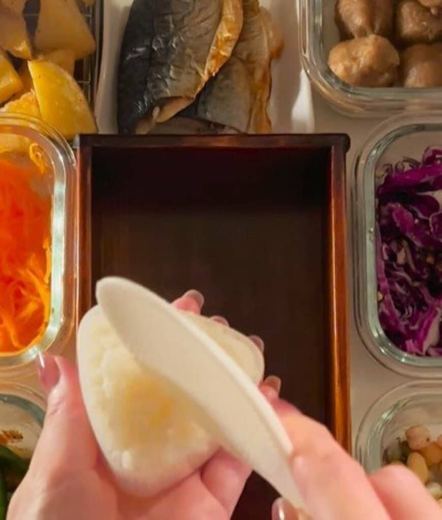 1. 【100均のおにぎり型が大活躍!】綺麗な三角おにぎりを最初に並べる