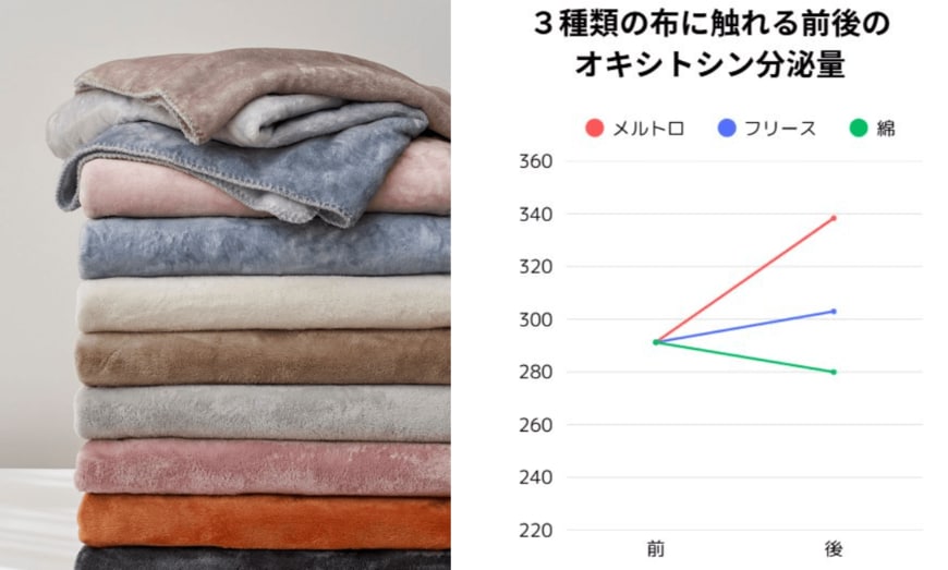 実験は、meltoro・フリース・綿の3種類の素材に触れたときの「唾液中のオキシトシン分泌量の変化量」を比較するというもの。オキシトシンとは、心地よいスキンシップや五感の刺激などによって分泌が促進されるホルモンのことです。