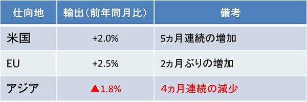 次に、2月の輸出金額は前年同月比▲1.2%のマイナスとなり、3か月連続のマイナスとなりました。1月の輸出金額は前年同月比▲8.4%と大きな減速を記録したため、1月との比較では改善しているものの、前年同月比でマイナスです(春節の影響を受けている可能性があります) 。地域別に見た場合、米国、欧州と比較して、アジア向けが弱いことが目立ちます(図表1ご参照)。