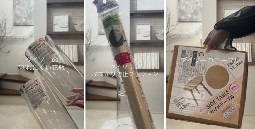 今回の動画では、ダイソーの「割れにくい花瓶」2個、「ぶつかり防止クッション(アイボリー)」9本、そして「サイドテーブル」の天板などを使って、オリジナルサイドテーブルを作ります。