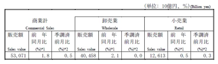卸売業の販売額は40兆4,580億円で、前年同月比2.1%の増加となりました。季節調整済前月比では0.0%の横ばいです。