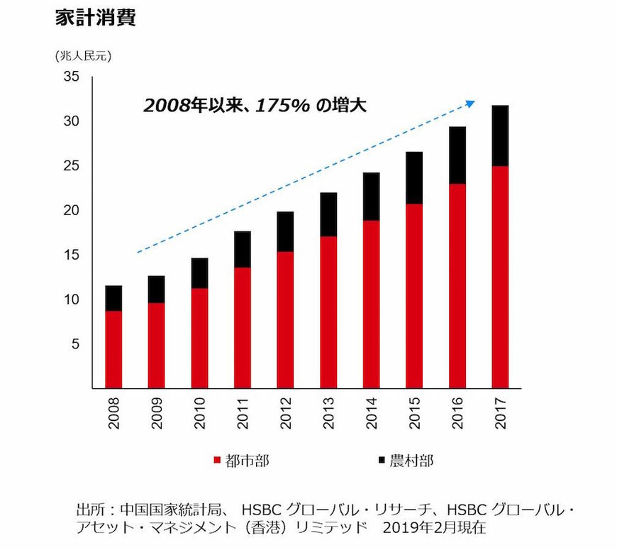 また、一人当たりの可処分所得の伸びが消費支出を下支えし、家計消費は2008年以来、175%も増大しました。