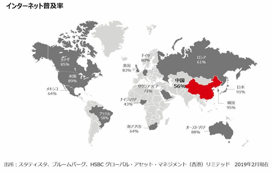 その一方、中国のインターネットの普及率は6割にも至らず、主要先進国の8~9割に比べ、相対的に低いことからも、インターネット普及率の高まりとともにさらなる消費の拡大も期待できます。