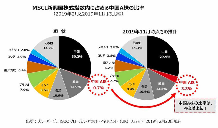 株価指数を開発・算出するMSCI社は、今年2月28日、同社各指数における中国A株(上海・深センの株式市場に上場している中国企業の人民元建て株式)の比率を5月、8月、11月の3段階に分けて引き上げていくことを発表しました。これにより、MSCI新興国株式指数の中国A株の比率は、4倍以上に拡大する見込みです。
