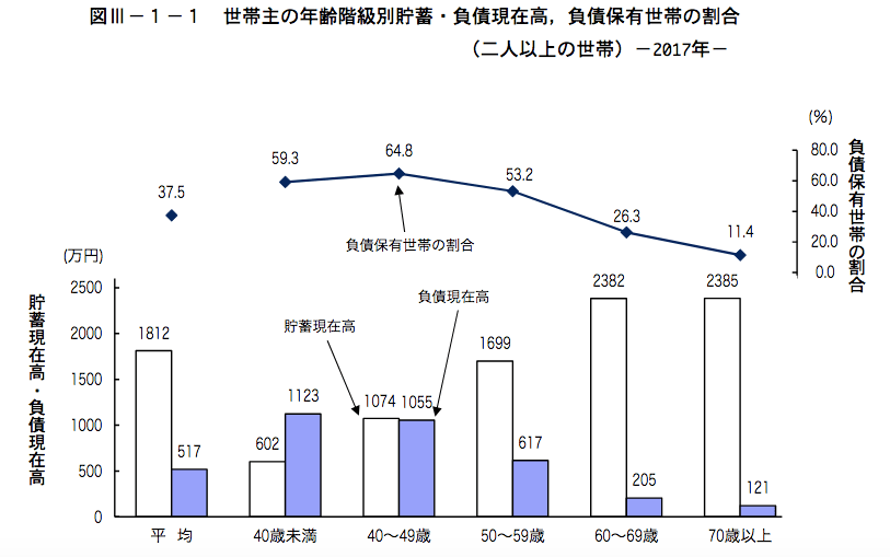 世代別に見ると、40代における二人以上世帯の貯蓄現在高の平均は1074万円と全体の平均よりかなり少なくなっています。
