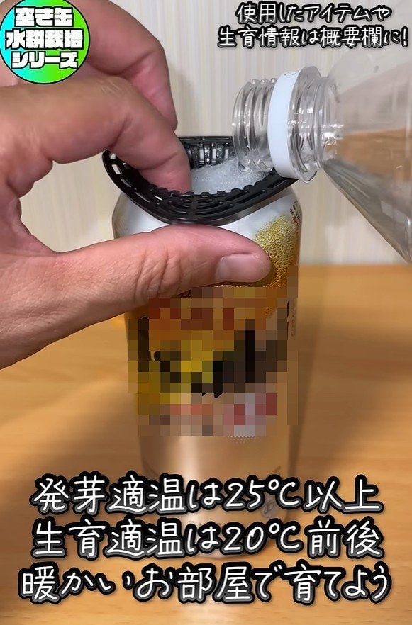 - 空き缶に水を入れ、鉢底ネットを置く
