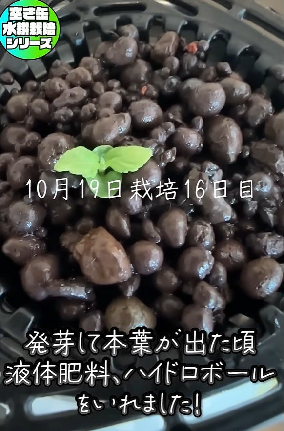 発芽して本葉が出たら、芽の支え&根の遮光目的でハイドロボールを投入。このタイミングで、空き缶内の水を液体肥料に変更します。ちなみに、みかんぼーや(@mikanbo-ya1987)さんがまいた種は、16日ほどで本葉が出たようです。