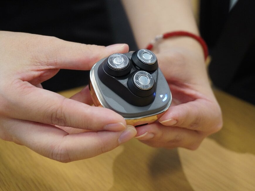 「CUVER」は、リングケースのようなサイズ感の回転機構を採用した⼩型電動シェーバー。ひげそりだけでなく、女性の産毛処理などの用途も想定しているとのこと。メタリックなカラーもインパクト大です。