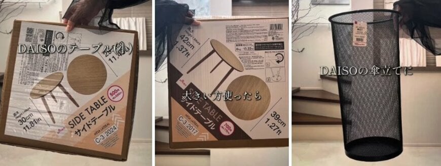 今回の動画では、ダイソーの「スチールメッシュ傘立て」と「サイドテーブル」を組み合わせて、スタイリッシュなサイドテーブルを作ります。