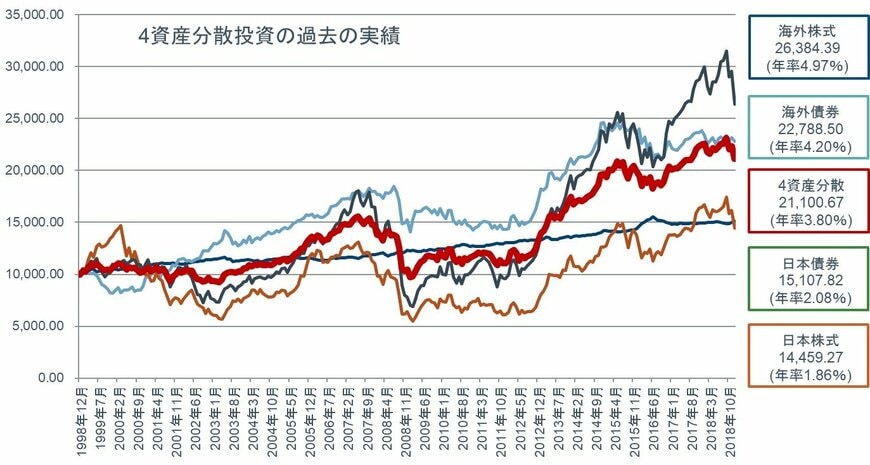 国内外の株式と債券の4つの資産の指数に分散投資し、20年の期間で運用した場合のパフォーマンスをみたものです。注目は、4資産分散投資の成果として、年率4%以上の収益率がもたらされていることです。