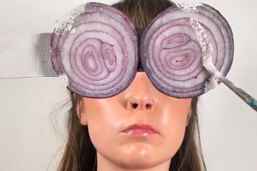 話題となっている動画では「玉ねぎ」を使用している@millybampaintiさん。両目の上に玉ねぎを配置すると……。