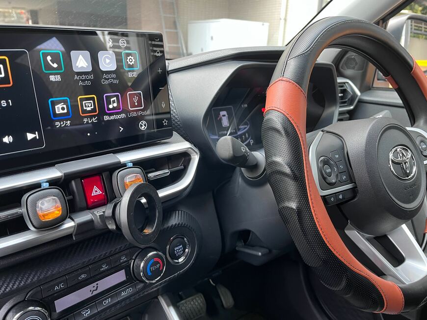 また、フロアマットにもこだわり、ライズ専用のダークウッドカラーのフロアマットに変えることで、車内をおしゃれな空間にしています。