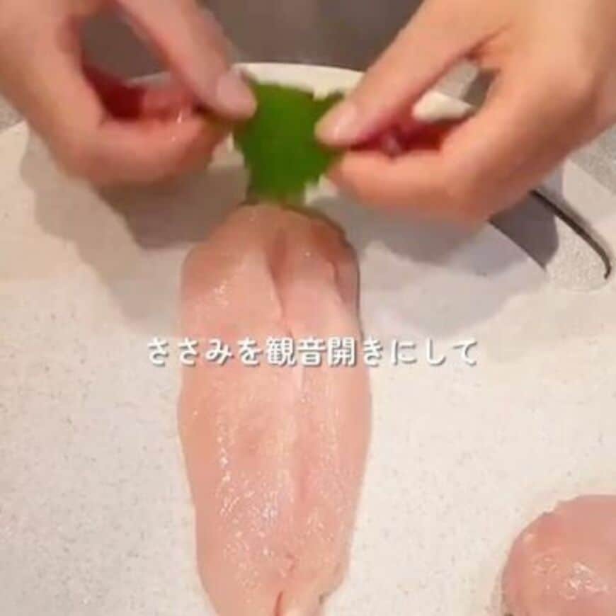 まず、開いたささみに大葉とチーズを乗せて、折りたたみます。