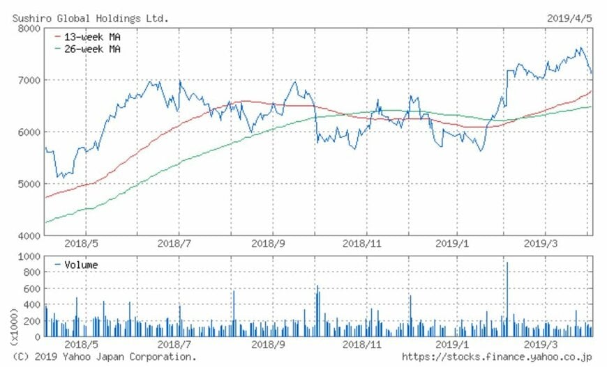 同社の株価は昨年6月の7,000円付近が天井となっていましたが、2019年2月に天井を上方ブレイクし、3月26日には7,710円に到達。その後下落しましたが、現在は7,300円付近で取引されています。