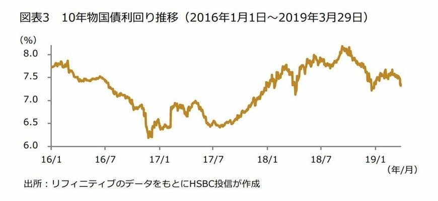インド株式市場は2019年2月下旬から上昇傾向、債券市場も2月末から堅調に推移(利回りは低下)している。インフレ率の落ち着き、インド準備銀行(中央銀行)の金融緩和に向けた動きが市場で好感されている。