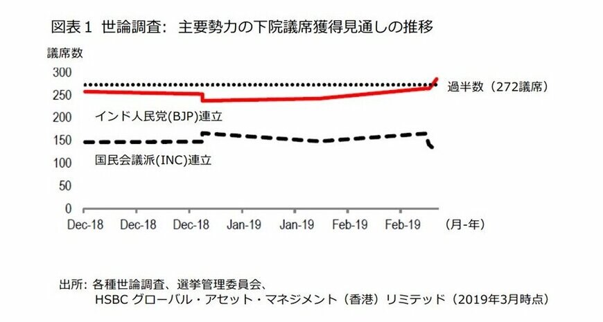 盤石ではない連立政権が生まれる可能性は投資家のセンチメントに影響を及ぼし、インドの株価は2018年末から低迷した。ただし最近の株価はBJPが政権を維持するとの期待が高まったことで上昇に転じている。