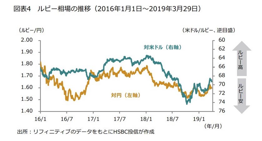 インドルピーは2月から対米ドル、対円で上昇している(2019年3月29日現在)。