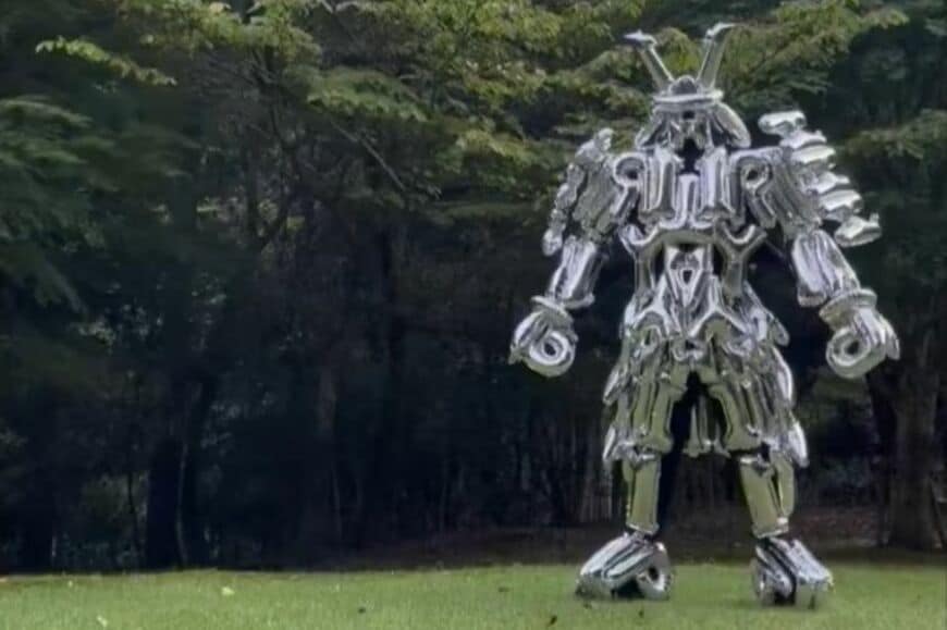 写っているのは、シルバーのボディが目を惹く「着ぐるみスーツ」をまとった人の姿。よく見ると背丈は木の高さに近いようで、かなり大きいサイズであることがわかります…。