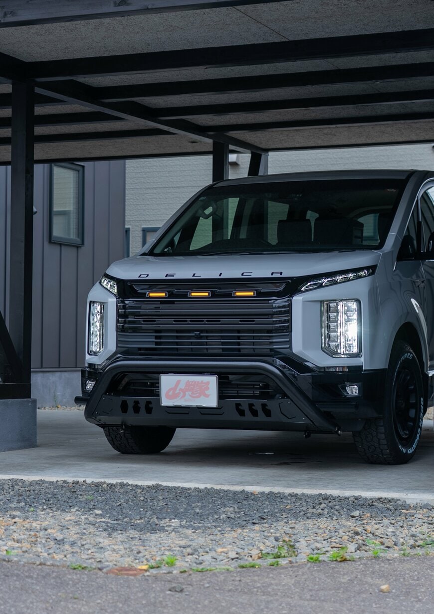 ツヨシさんの愛車は、本来のデリカの良さを残しつつ、フロントバンパーガードやホワイトレターのタイヤを装着することで、洗練された力強さが際立つミニバンとなっています。
