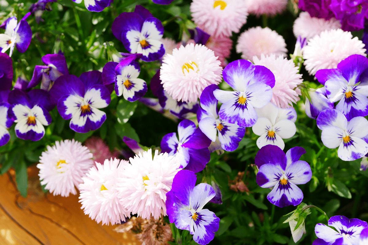 ビオラの色を複数混ぜて植えると、より自然で生き生きとした表情が生まれますよ。ハンギングバスケットに植えて、目線の高さで楽しむのも素敵です。