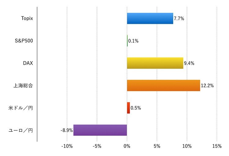 ただし、日本株は主要国で唯一下落しました。ドル円相場は円高になり、この1年間を見るとほぼ横ばいになっています。
