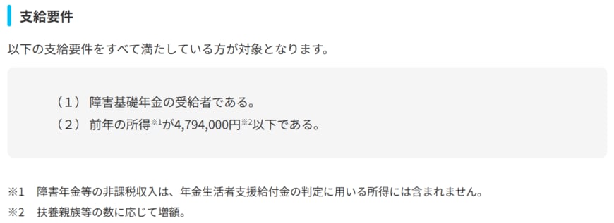 障害年金生活者支援給付金は、障害基礎年金を受給していて、かつ所得が一定水準以下の方を対象としています。