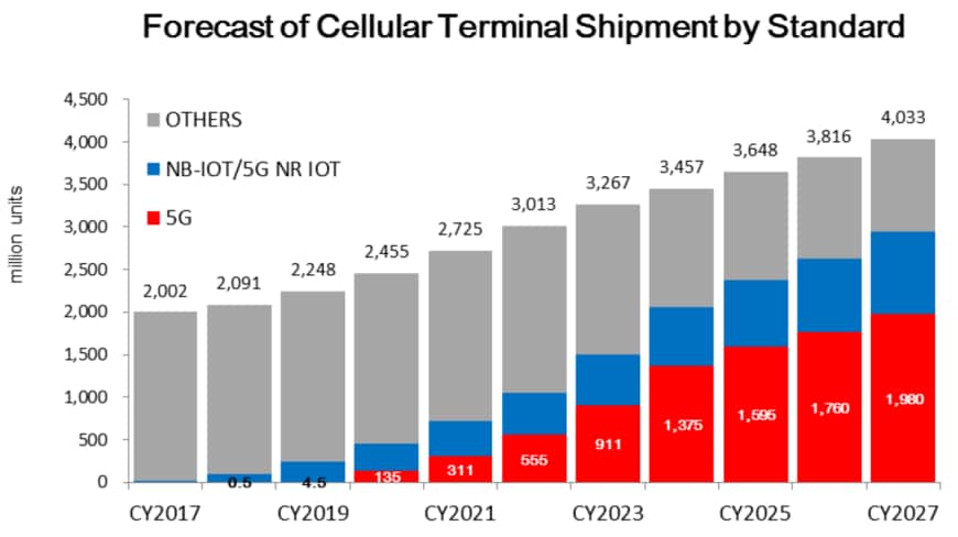 レポートによると、27年のこれらセルラー対応製品の総出荷規模は40億3200万台となり、このうち5G対応製品の出荷規模は19億8000万台と予測。主な内訳は、スマホが12億台、NEW Product Xが4億台、ノートパソコン・タブレットPCが2億8000万台、その他1億台となる。