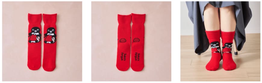 裏起毛であたたかなルームソックス。ペンギンが編み物をしている赤バージョンと温泉で子ペンギンと一緒にあたたまった青バージョンの2種類を用意しています。価格は各990円。