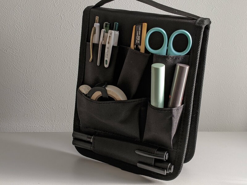定規など少し長めのアイテムも、ややはみ出るものの問題なく収納できます。持ち運びたい場合は、裏側のメッシュポケットに入れると収まりが良いです。