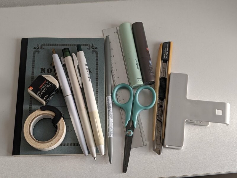 収納量としては、写真にあるとおり、ペン数本、ハサミ、消しゴム、定規、カッター、ノートなどをまとめて入れられる十分な容量がありました。まだ追加もできそうでしたよ。