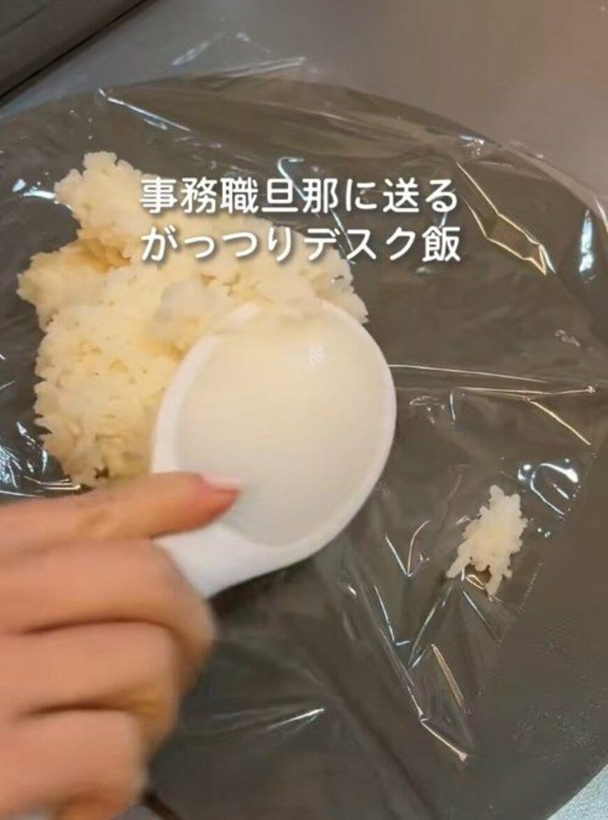 ご飯をラップで巻いて、ロール状になるように形を整えます。