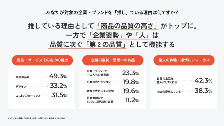 なぜ、その企業を推しているのか尋ねると、理由のトップは「商品の品質」が49.3%でした。次いで「自分の生活を豊かにしてくれる」が42.3%、「昔から愛用している」が38.3%であり、自分が使いたいと思う商品を提供している企業を推したくなるということがわかります。