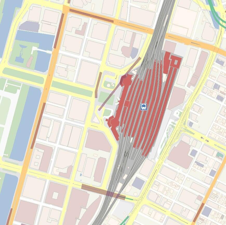 地図を見てみると、たくさんの路線が乗り入れる鉄道駅ということがわかります。そして、駅の正面からまっすぐ伸びる道も目立っていますね。