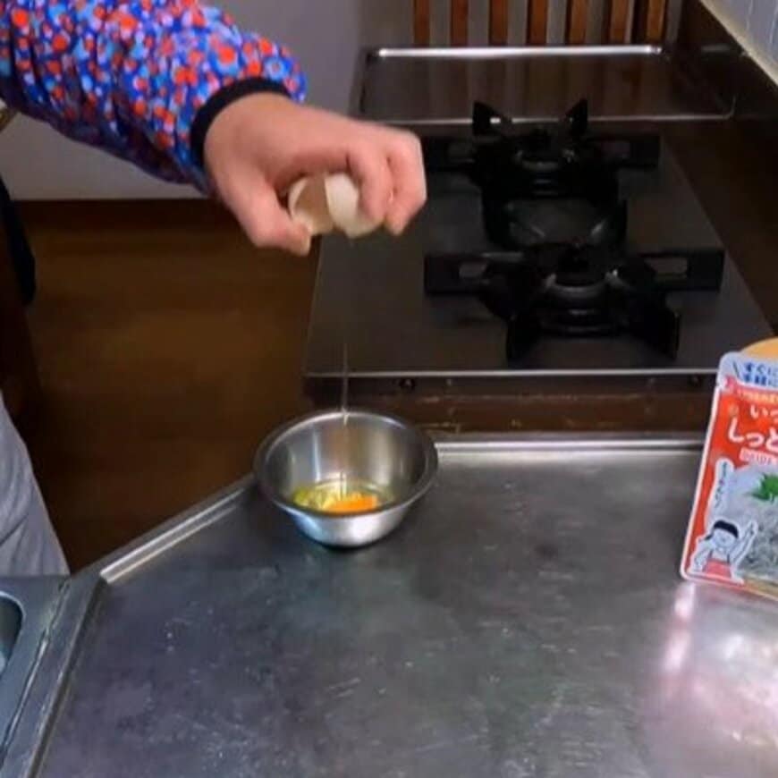 片手で卵を割る仕草からも料理上手な雰囲気が伝わってきます。慣れた様子で綺麗な卵焼きが完成しました。
