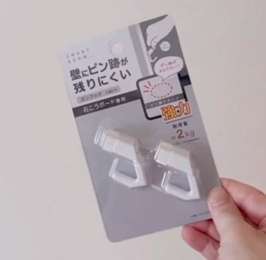 今回の動画では、セリアで購入した「壁にピン跡が残りにくいピンフック」を使って、玄関の壁に「帽子掛けスペース」を作ります。