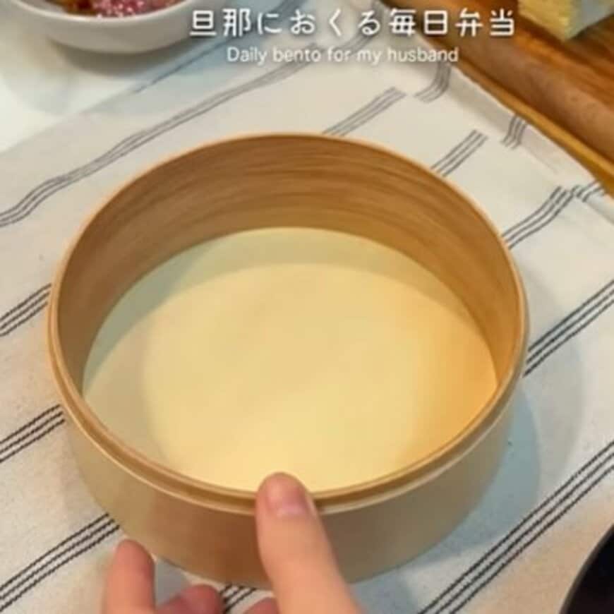 まずは、まんまる曲げわっぱのお弁当箱に、雑穀米ご飯を詰めていきます。