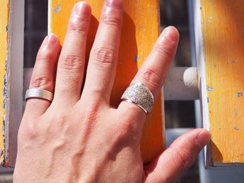 ナバホ族やズニ族と並んで有名なホピ族のアーティスト、マーリン・ホンホングヴァが手がけたリングです。シルバープレートに銀粉を焼き付けたデザインは装飾的すぎず、コーデに取り入れるにもちょうどいい存在感。初めてインディアンジュエリーを買うのにうってつけな逸品です。