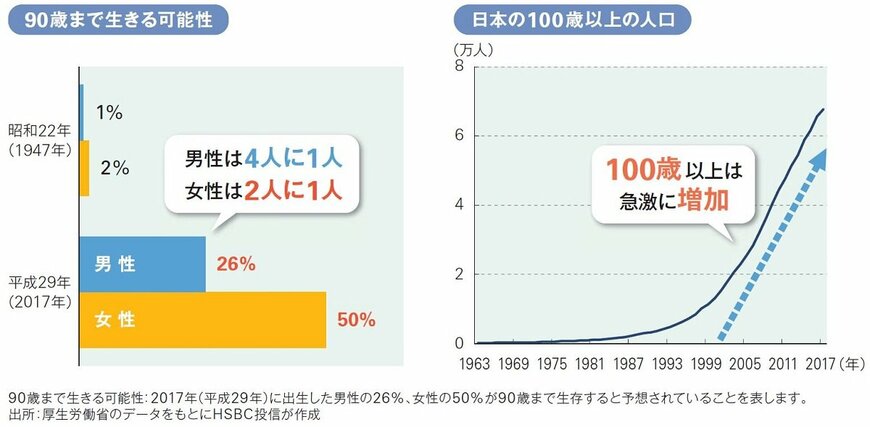 日本は、世界に先駆けて「超高齢社会」に突入しました。厚生労働省発行の簡易生命表によると、90歳まで生きる可能性のある人口割合は、終戦後の1947年では、男性は0.9%、女性は2.0%に過ぎませんでしたが、2017年には男性は25.8%、女性は50.2%、つまり、男性は4人に1人、女性は2人に1人の割合で90歳以上まで長生きしていると言えます。