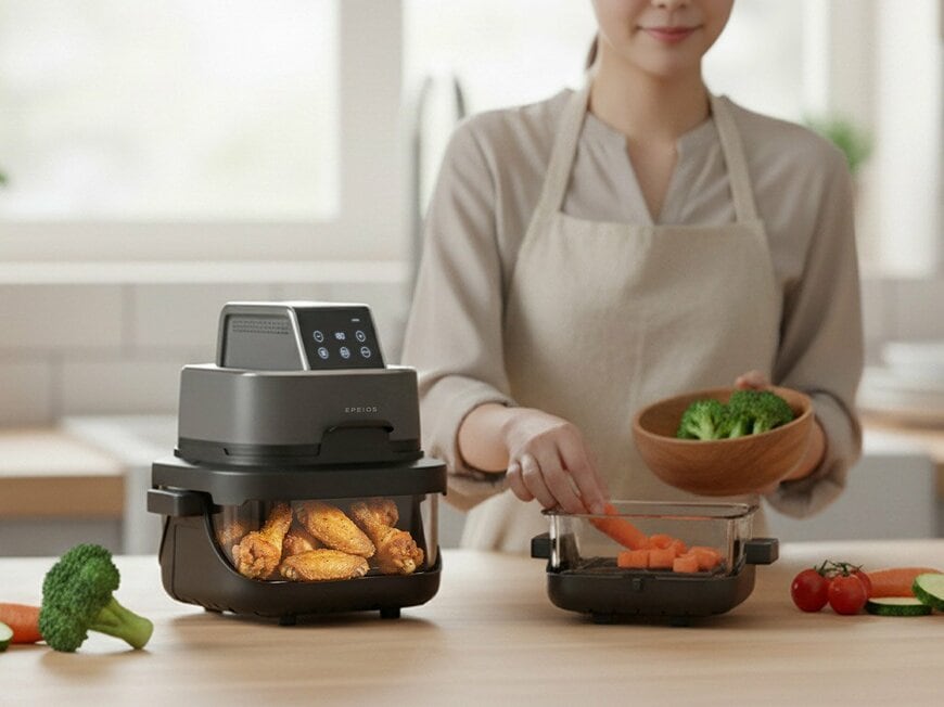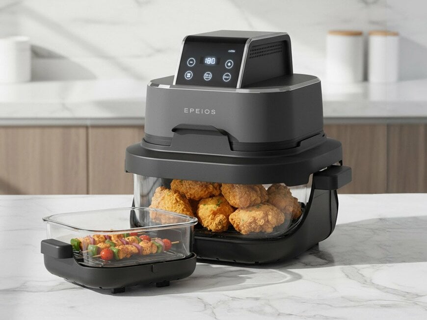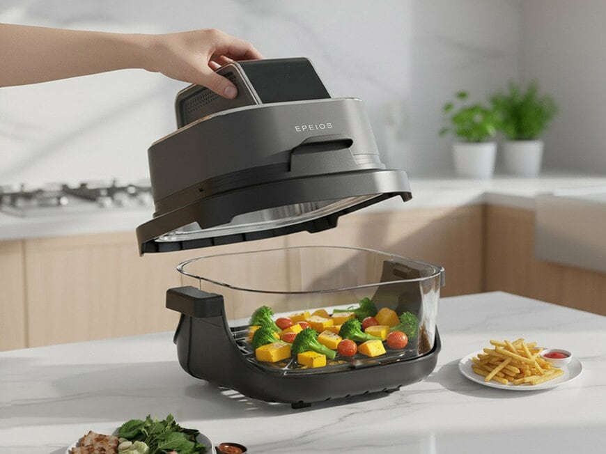 EPEIOS JAPAN「ガラスボウルエアフライヤー」は従来のエアフライヤーとは異なり、食材を入れるバスケット部分に耐熱ガラス製のボウルを採用。調理中の食材の状態を目で確認できるため、火の通り具合や焼き色を見ながら仕上がりを調整できます。